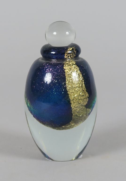 Lot de Quatre différents flacons en verre soufflé. Signés. H. 12,5 cm et 9, au prix de 80 à 100 € en vente aux enchères par l'hôtel des ventes Primardeco