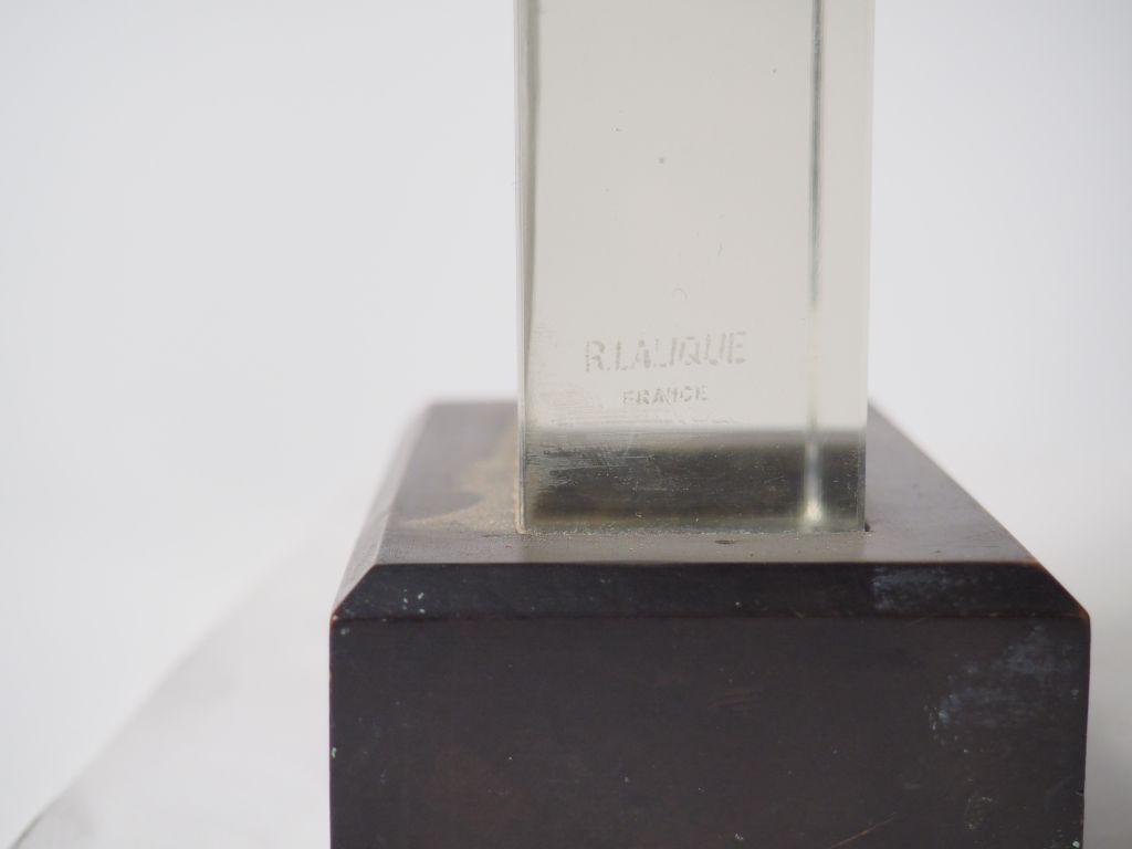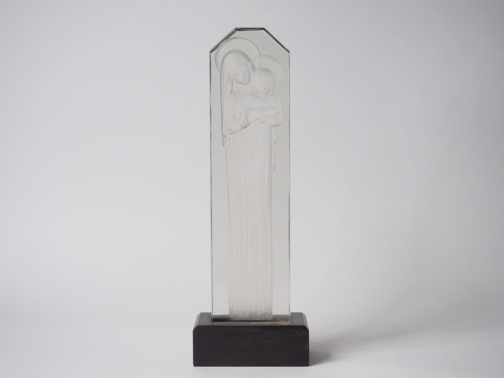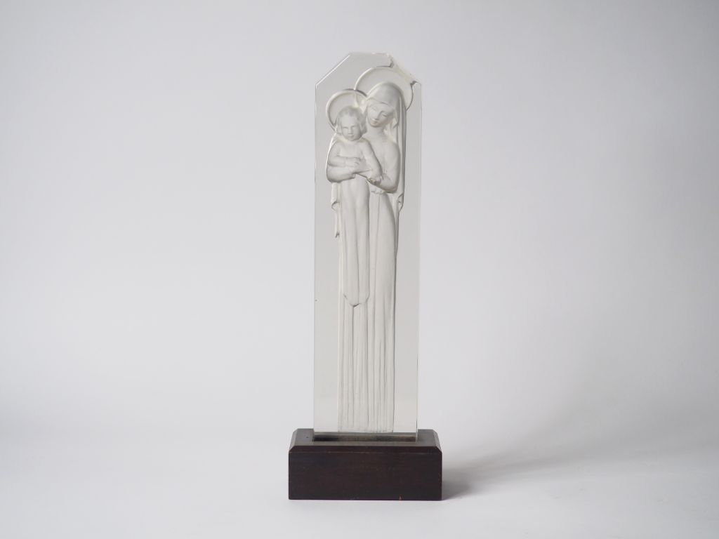 R. LALIQUE. "Vierge à l'enfant". Sculpture en verre blanc moulé-pressé, socle en bois. Signée. Dim. Avec le socle :