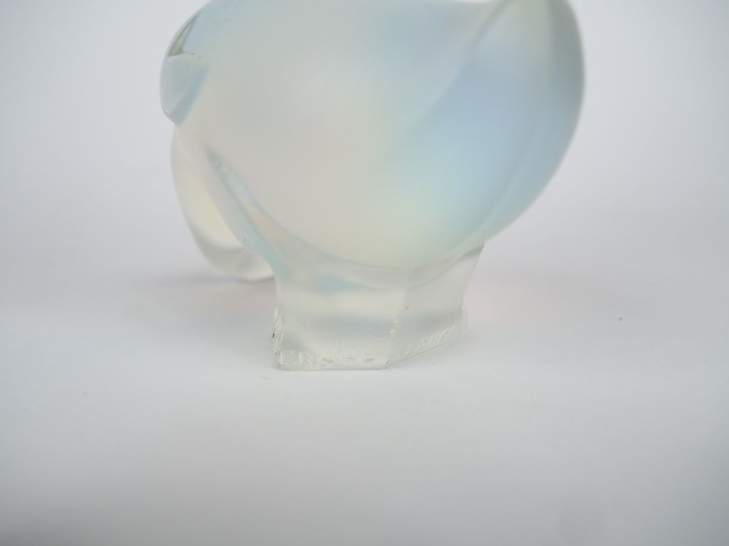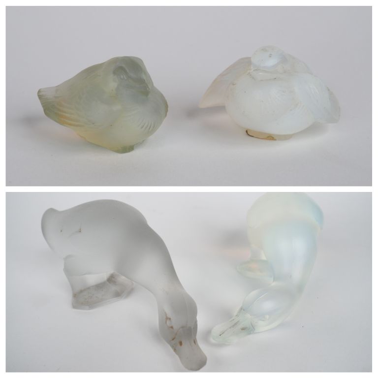SABINO. Deux petits sujets en verre opalescent, "moineaux". Dim. 3,5 x 5 cm. (égrenure). On y joint deux sujets en verre, "canard". Signés. Dim. 6 x 14,5 cm. (choc à la base de l'un).
