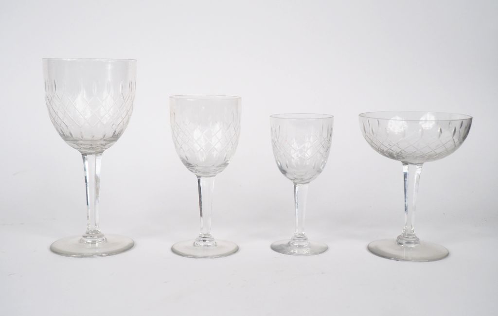 SAINT-LOUIS. Partie de service de verres en cristal modèle Toscane comprenant : - 9 verres à eau - 11 verres à vin - 12 verres à Sauternes ou à Porto - 9 coupes à champagne