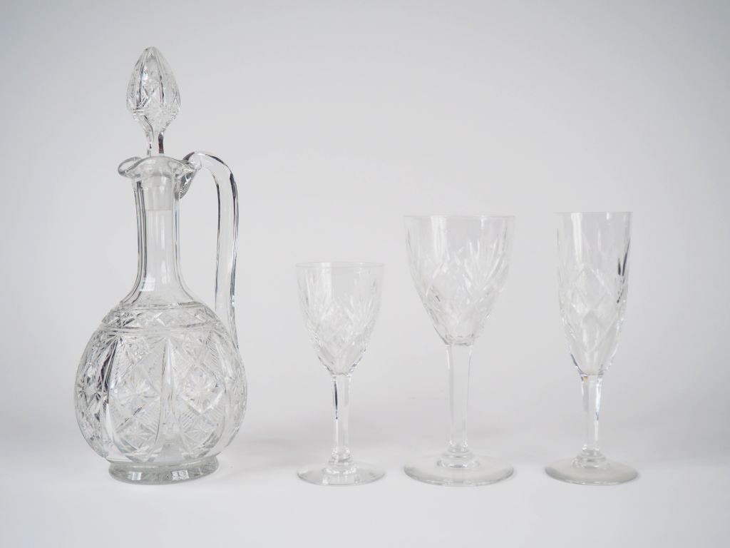 SAINT LOUIS. Partie de service de verres en cristal taillé, comprenant : - 12 verres à eau - 12 verres à vin - 6 flûtes à champagne - 1 carafe Signés.