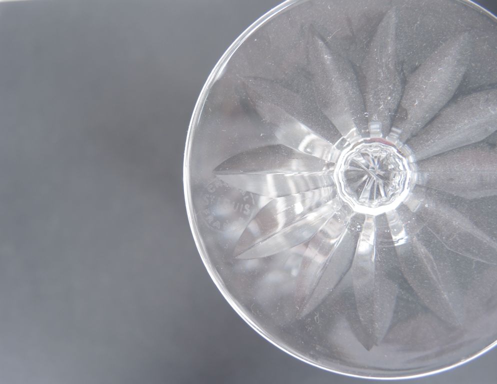 SAINT LOUIS. Service de verres en cristal. Comprenant : - 12 verres à pied en cristal bicolore. - 12 flûtes à champagne (une micro égrenure) - 14 verres à eau (deux micro égrenures à l'un) - 14 verres à vin (trois micro égrenures) Signés.