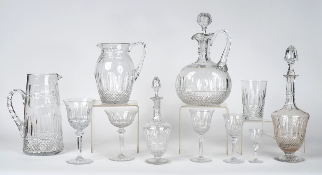 SAINT-LOUIS Service de verres en cristal comprenant : 3 flacons (signés) 2 carafes (signées) 12 coupes (non signées) 17 verres à eau (6 signés, une égrenure) 15 verres à vin rouge (3 signés) 10 verres à vin blanc (non signés) 7 verres à digestif (non signés) 4 verres à long drink (non signés)