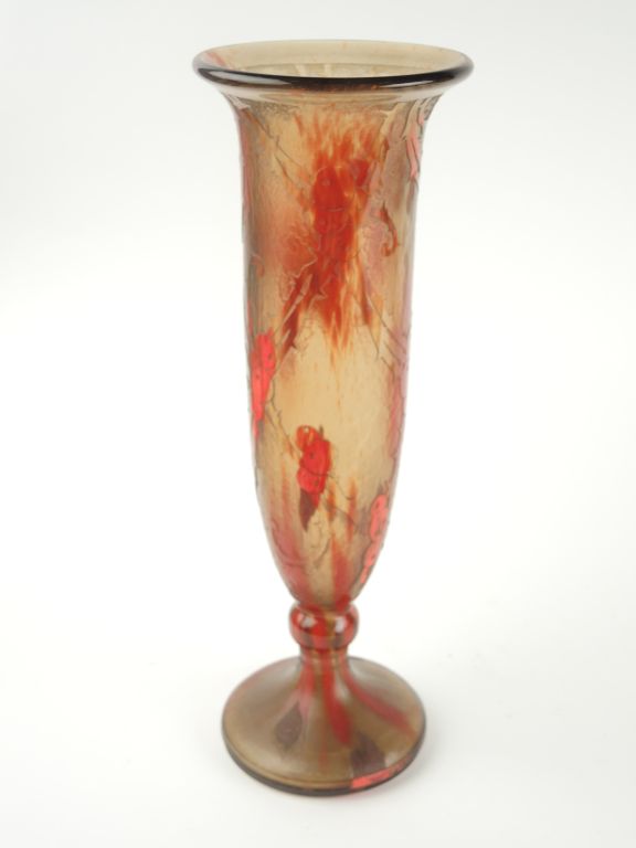SCHNEIDER. Vase en verre gravé en camée à l'acide de motifs oranges sur fond poudré jaune et orange. H. : 43 cm (défaut de cuisson sur le pied, non signé)