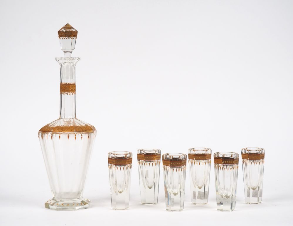 Service à liqueur en cristal émaillé et doré, comprenant : un flacon et six verres.