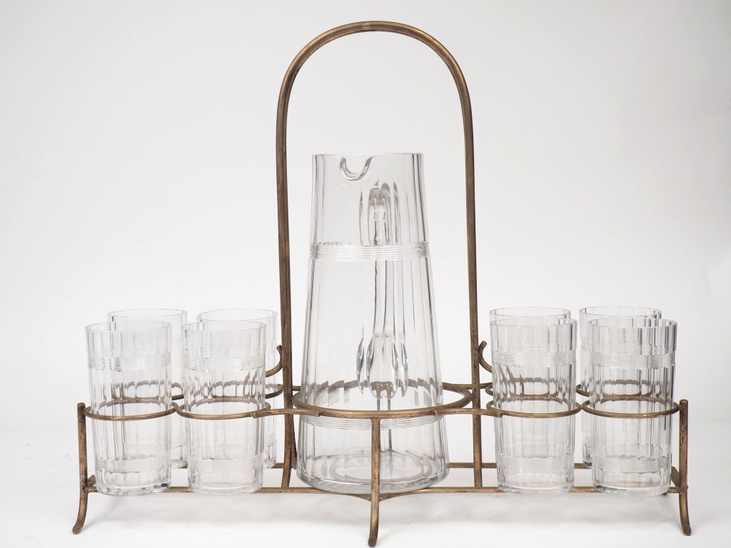 Service à orangeade de style Art déco en cristal avec son présentoir en métal. Comprenant : - un carafe - huit verres