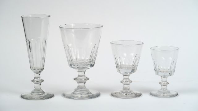 Service de verres en cristal comprenant : 15 flûtes, 9 verres à eau, 13 verres à vin rouge, 13 verres à porto (petites égrenures)