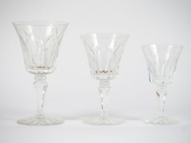Service de verres en cristal de Saint Louis, modèle 'Camargue' comprenant : 12 verres à eau, 11 verres à vin rouge, 12 verres à Sauternes