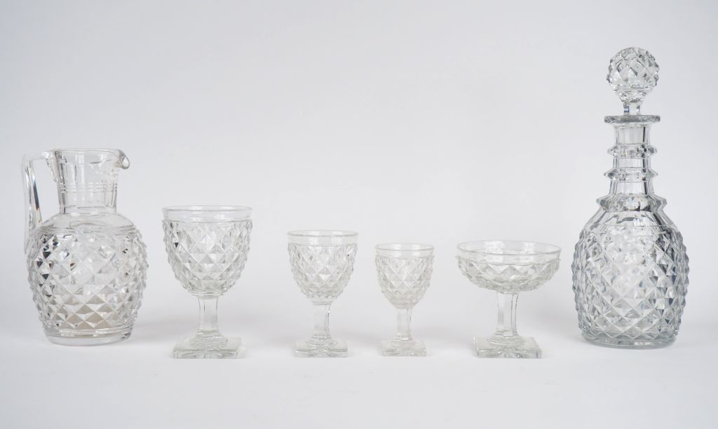 Service de verres en cristal XIXème à décor de croisillons comprenant : - 12 verres à eau - 11 verres à vin rouge - 12 verres à Sauternes - 12 coupes à champagne - 2 flacons - 2 carafes