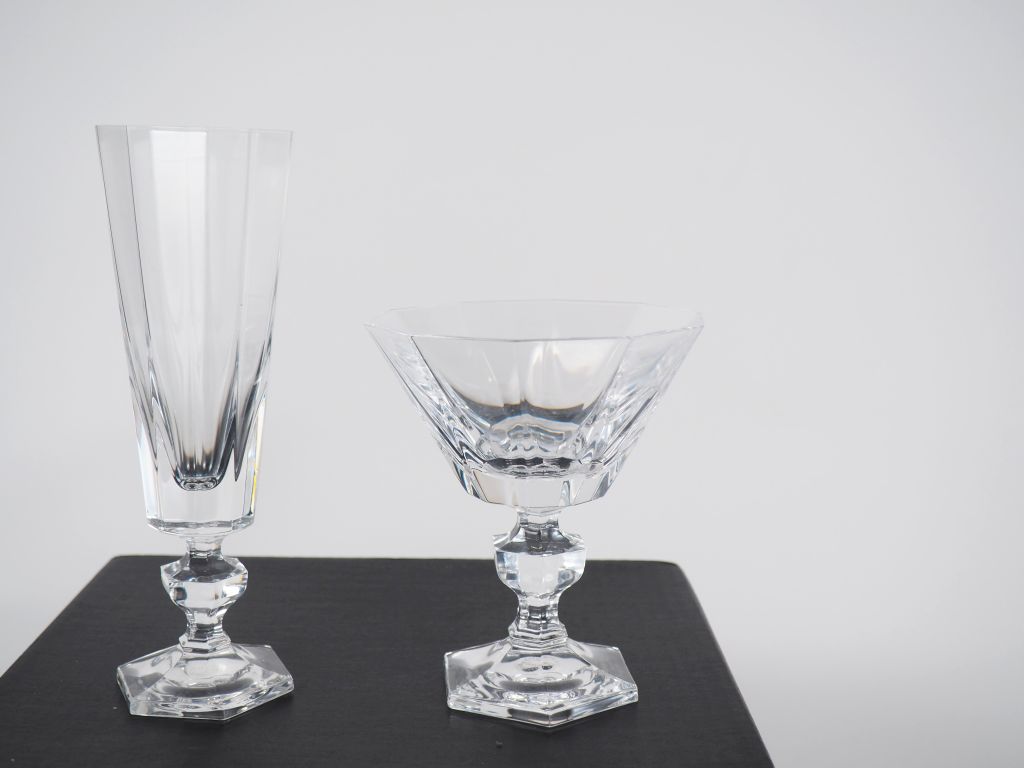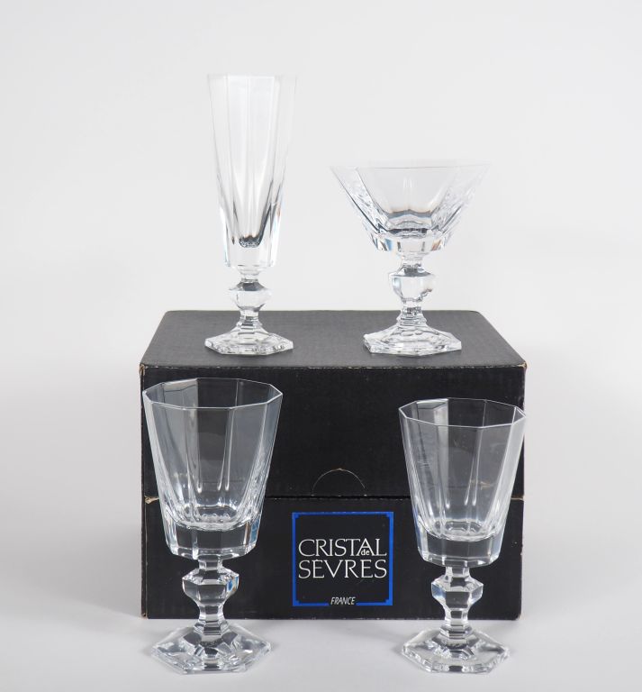 SEVRES. Service de verres en cristal comprenant : - 12 verres à eau - 9 verres à vin - 12 flûtes à champagne - 12 coupes à champagne Signé.