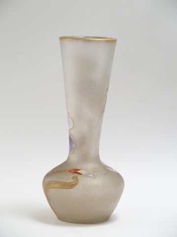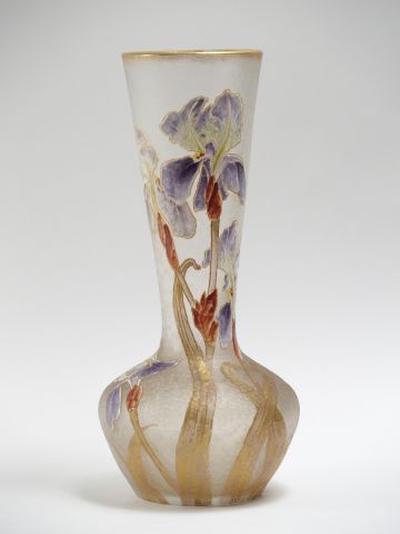 Vase 1900 en cristal givré, à décor émaillé d’iris. H. : 41 cm.