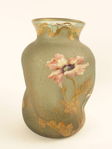 Vase Napoléon III en cristal givré torsadé à décor émaillé et doré de fleurs et de rinceaux. H. 28,5 cm