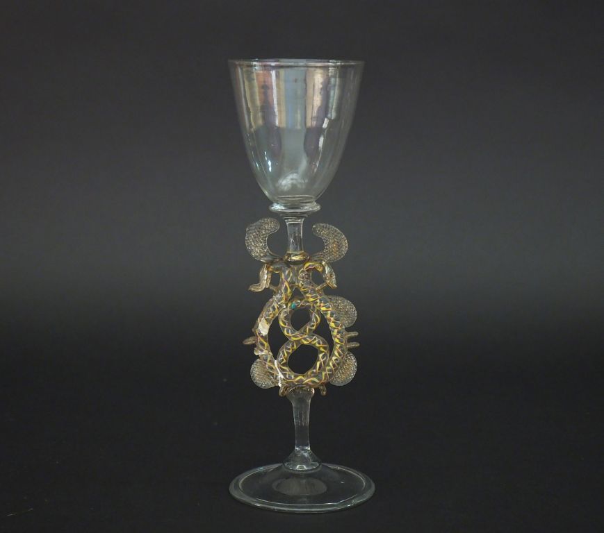 VENISE. Grand verre XVIIème en verre filé, à décor ajouré d'entrelacs. H. 24 cm. (Restauration).