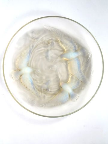VERLYS. Coupe en verre et verre opalescent à décor d'oiseaux et de poissons. Signée Diam. 35,5 cm