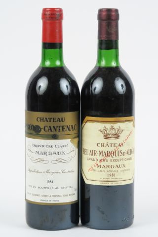 2 BOUTEILLES : 1 CHÂTEAU BOYD CANTENAC GCC MARGAUX 1984 LB - 1 CHÂTEAU BEL AIR MARQUIS D'ALIGRE GRAND CRU EXCEPTIONNEL MARGAUX 1981 LB