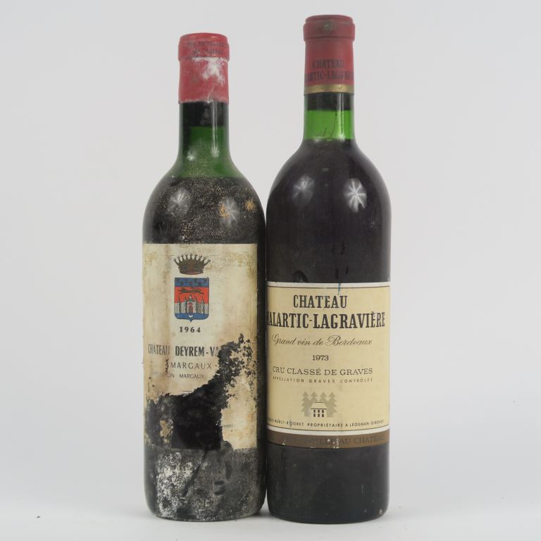 2 BOUTEILLES : 1 CHÂTEAU MALARTIC LAGRAVIÈRE CC GRAVES 1973 BG - 1 CHÂTEAU DEYREM VALENTIN MARGAUX 1964 HEP-MEP/ETA