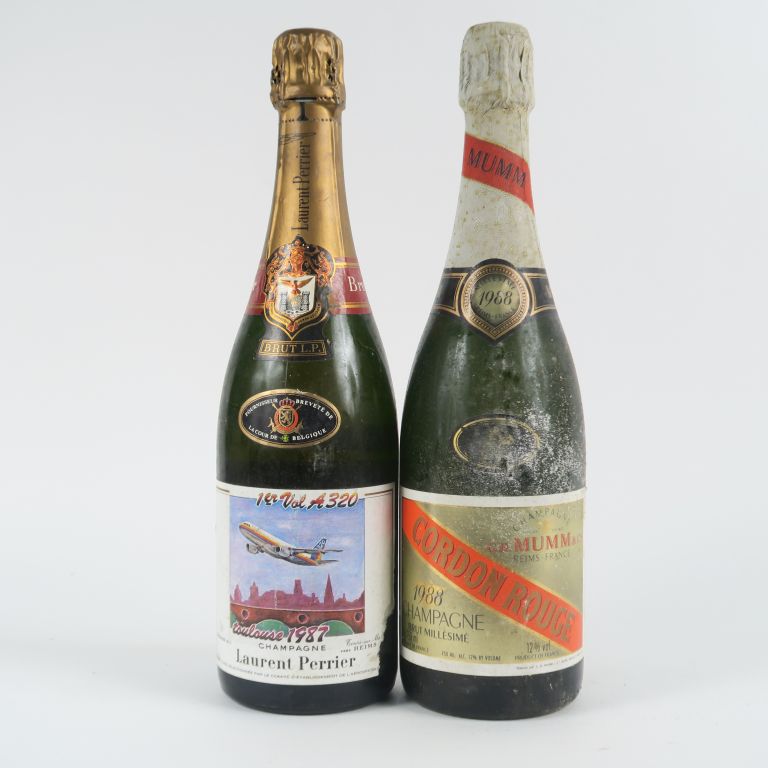 2 BOUTEILLES : 1 MUMM CORDON ROUGE 1988 - 1 LAURENT PERRIER 1er VOL A 320 TOULOUSE 1987