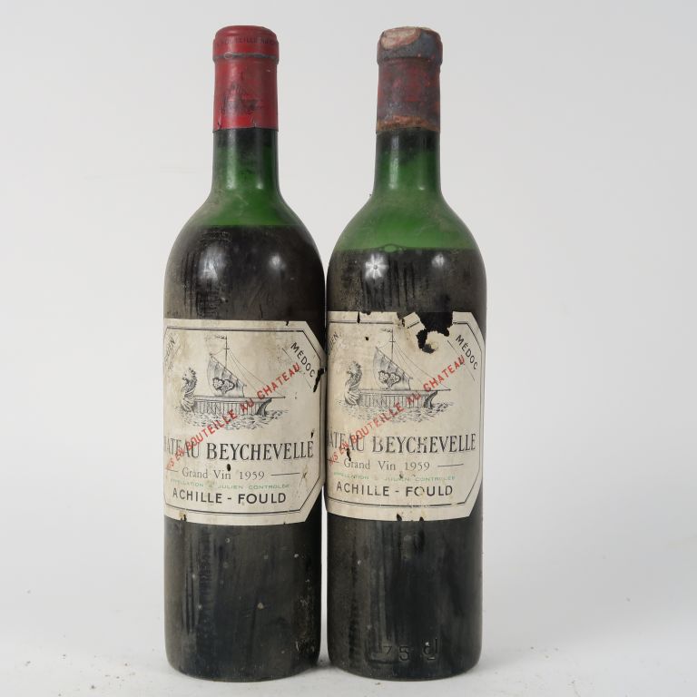 2 BOUTEILLES CHÂTEAU BEYCHEVELLE GCC ST JULIEN - 1959 - 1 MEP/1 BEP/ELA/BS/1 CAPS CORRODÉE