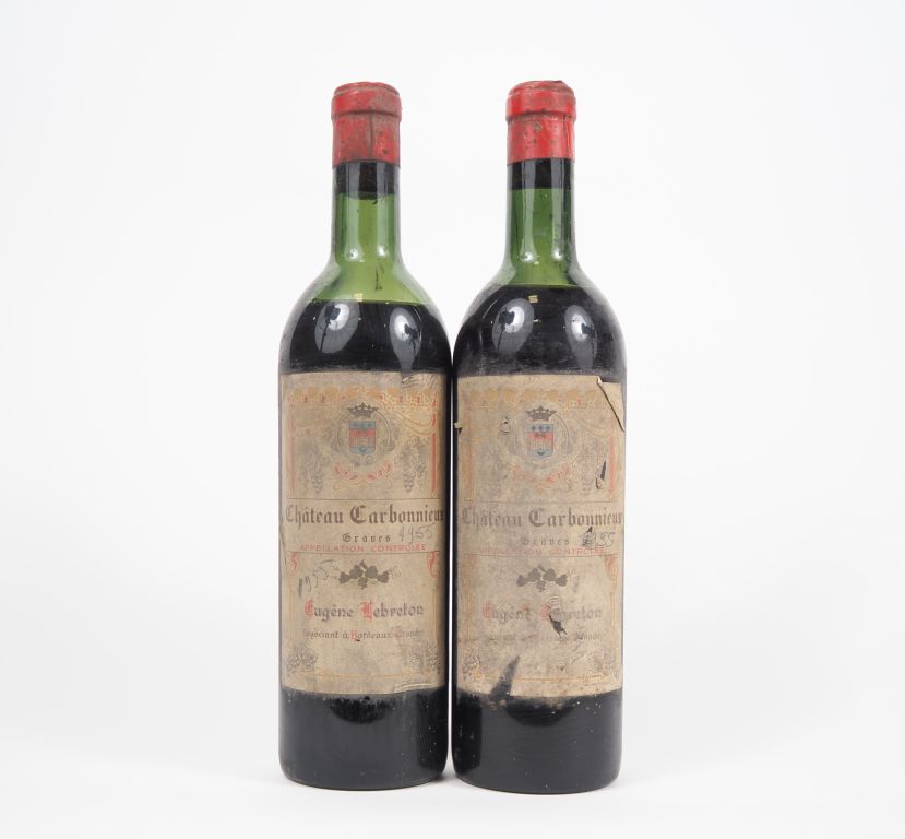 2 BOUTEILLES CHÂTEAU CARBONNIEUX GRAVES MISE EUGÈNE LEBRETON - 1955 - MILLÉSIME MANUSCRIT - 1 MEP/1 BEP CAPS CORRODÉE/ETA