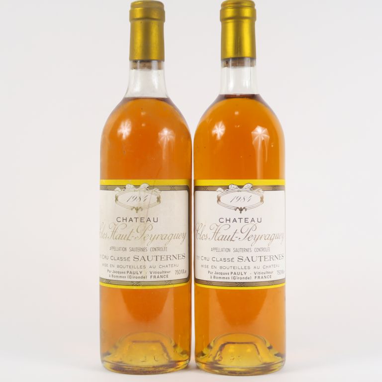 Lot de 2 BOUTEILLES CHÂTEAU CLOS HAUT PEYRAGUEY 1er CC SAUTERNES - 1984 - BG au prix de 30 à 40 € en vente aux enchères par l'hôtel des ventes Primardeco