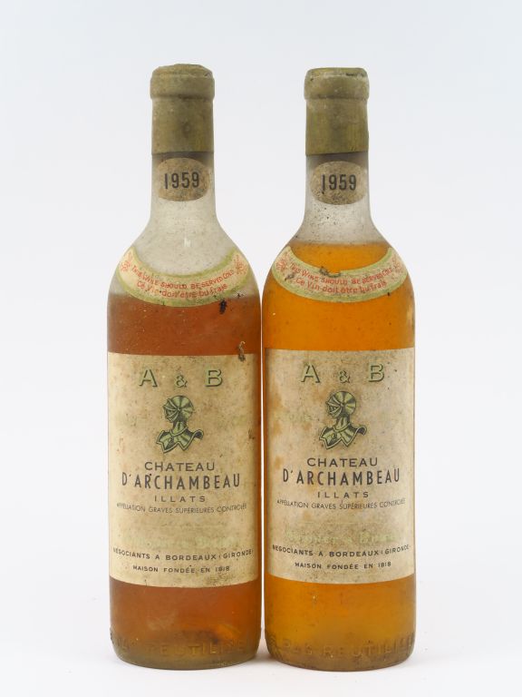 Lot de 2 BOUTEILLES CHÂTEAU D'ARCHAMBEAU GRAVES SUPERIEUR - 1959 - 1 HEP/1 BE au prix de 30 à 40 € en vente aux enchères par l'hôtel des ventes Primardeco