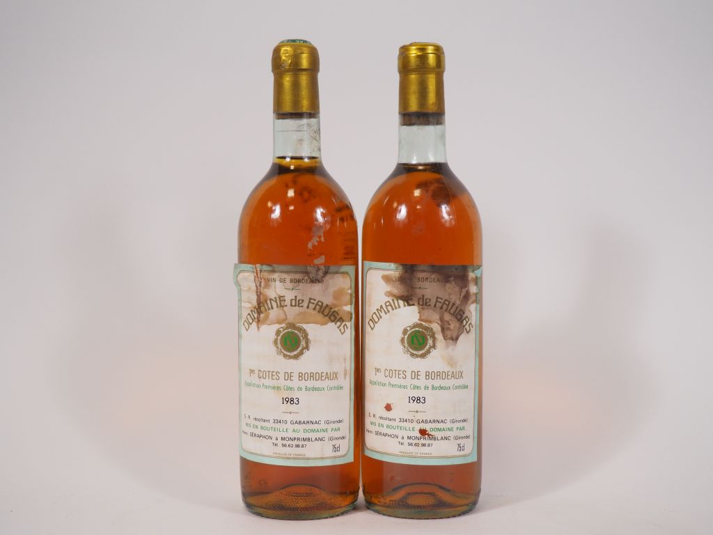 2 BOUTEILLES CHÂTEAU DE FAUGAS 1eres CÔTES DE BORDEAUX - 1983 - 1 BG/CAPS LEGER CORRODEE/ETA - 1 ETA