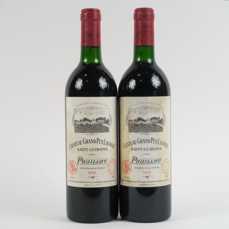 Lot de 2 BOUTEILLES CHÂTEAU GRAND PUY LACOSTE GCC PAUILLAC - 1988 - BG/ELT au prix de 80 à 90 € en vente aux enchères par l'hôtel des ventes Primardeco