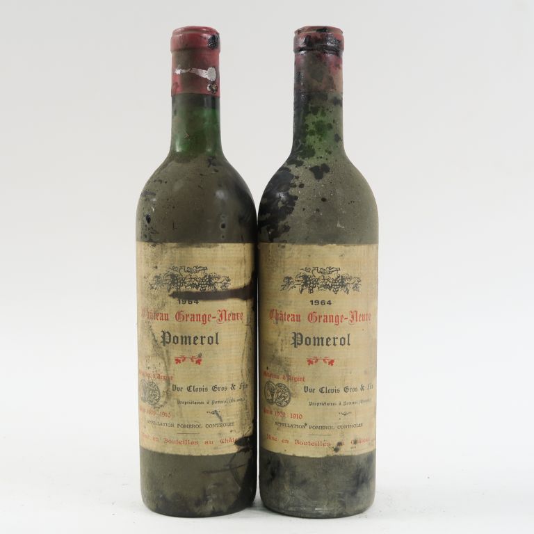 Lot de 2 BOUTEILLES CHÂTEAU GRANGE NEUVE C. GROS POMEROL - 1964 - 1 BG/1 LB-H au prix de 30 à 40 € en vente aux enchères par l'hôtel des ventes Primardeco