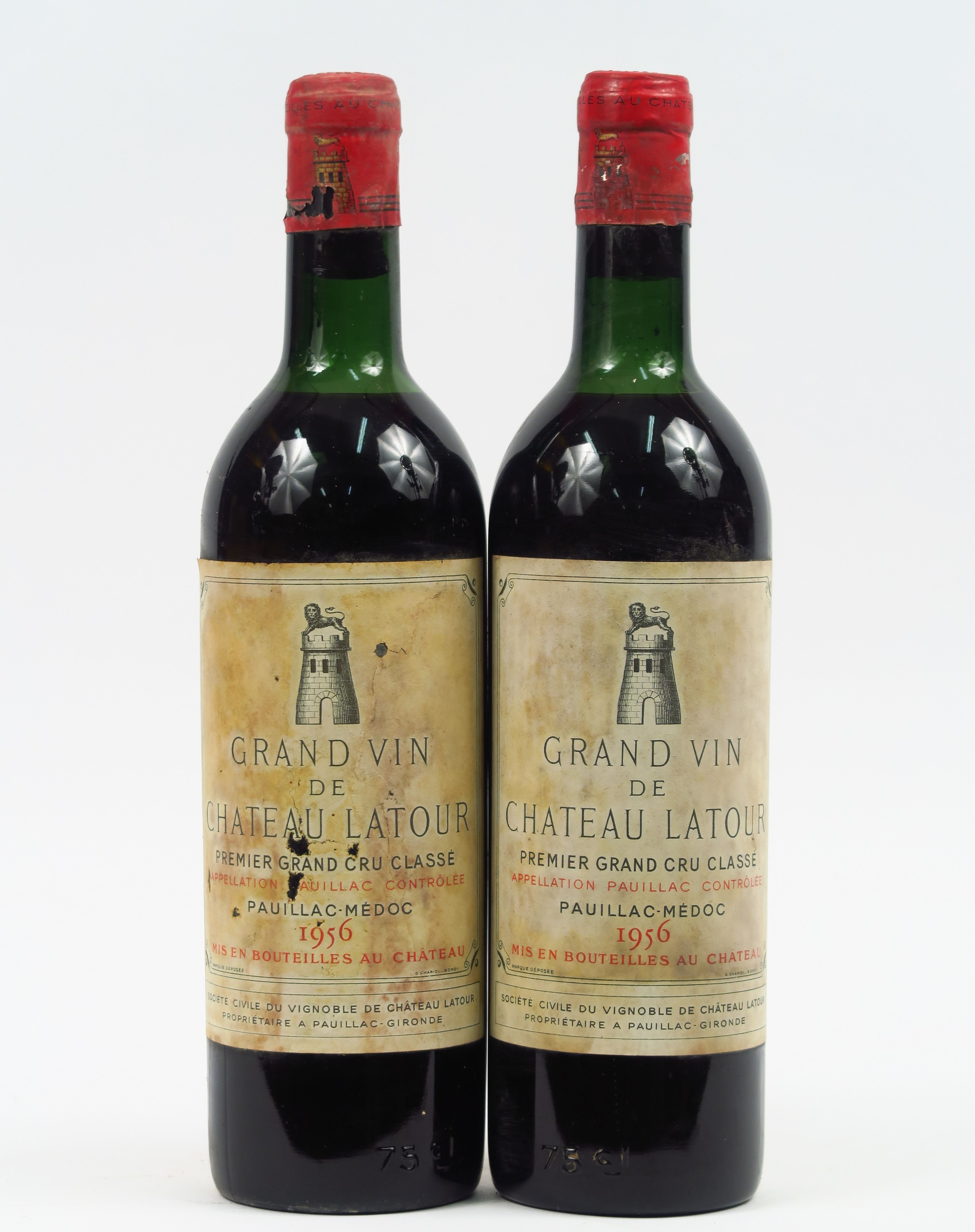 2 BOUTEILLES CHÂTEAU LATOUR 1er GCC PAUILLAC - 1956 - HEP/ELF/1 ELA/2 CAPS AB EN BORDURE