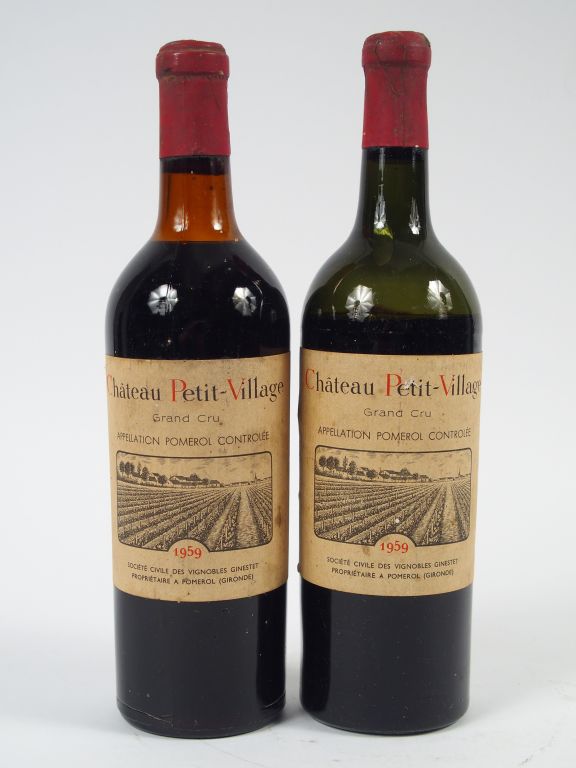 Lot de 2 BOUTEILLES CHÂTEAU PETIT VILLAGE POMEROL - 1959 - 1 LB/ 1 VIDANGE au prix de 100 à 120 € en vente aux enchères par l'hôtel des ventes Primardeco