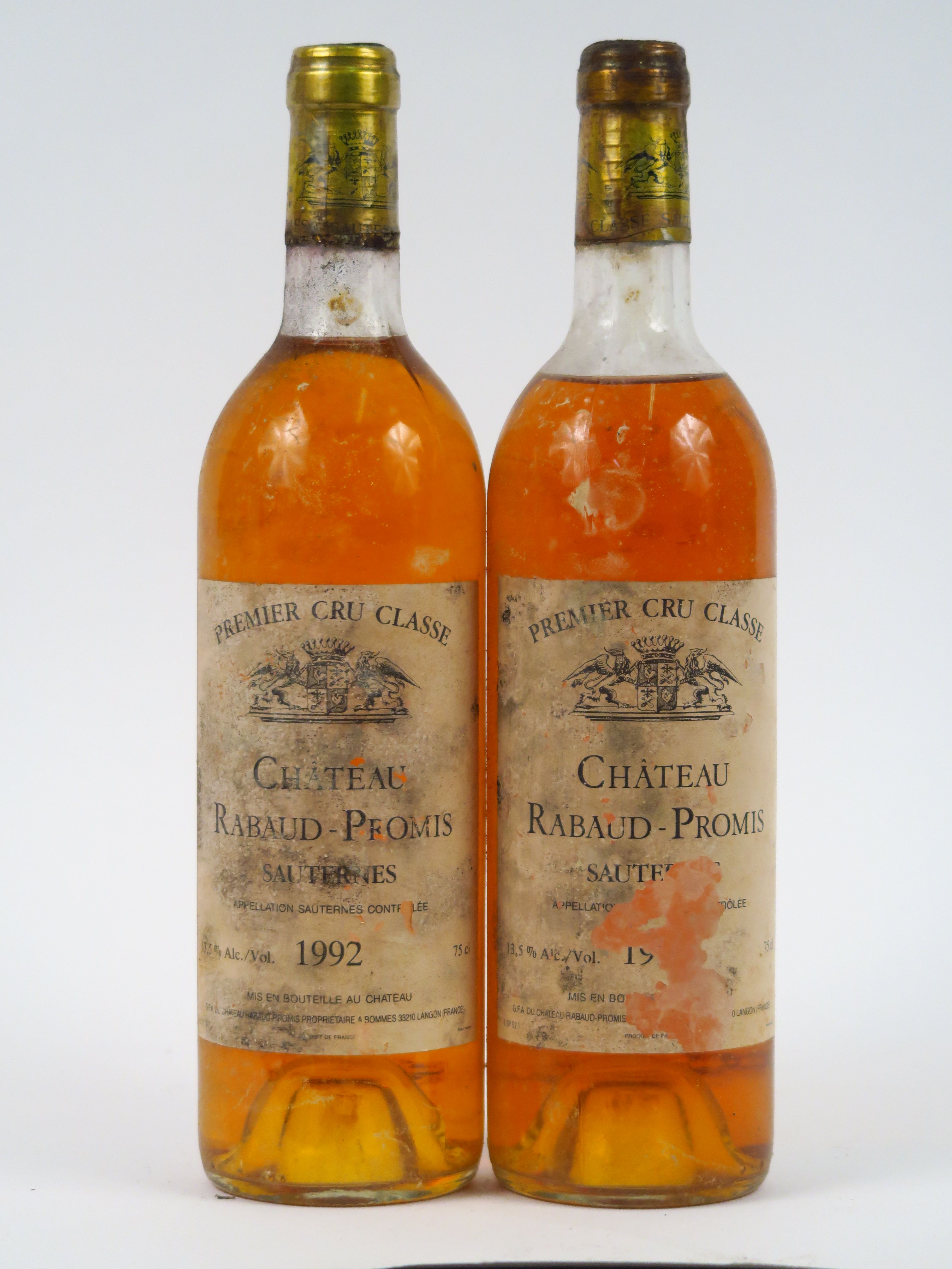 2 BOUTEILLES CHÂTEAU RABAUD PROMIS 1er CC SAUTERNES - 1992 - 1 BG/1 HEP-MEP/1 PRESUMEE/1 CAPS AB