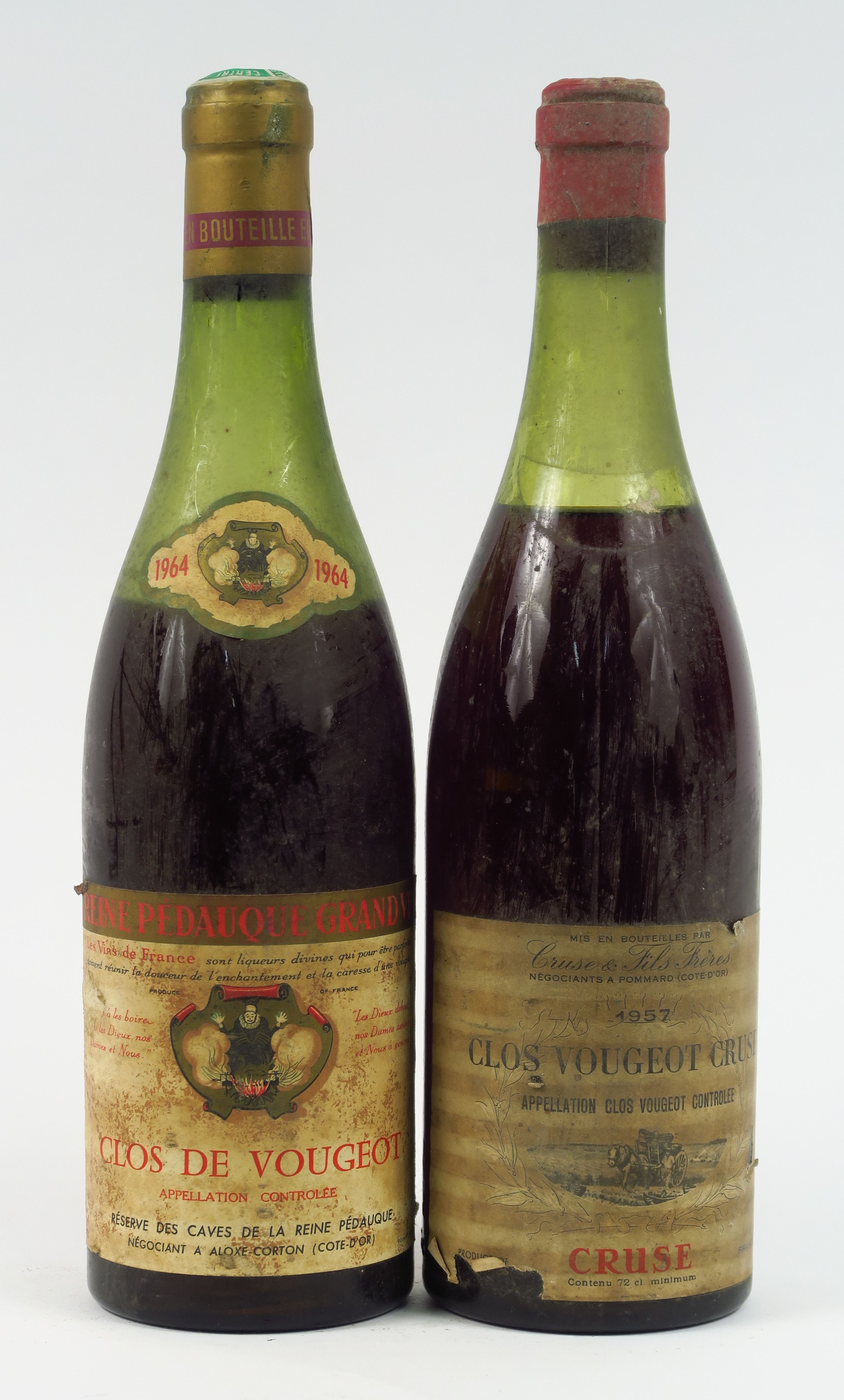 2 BOUTEILLES CLOS VOUGEOT : 1 CAVES DE LA REINE PEDAUQUE 1964 8 CM/EA - 1 CRUSE 1957 6 CM/EA