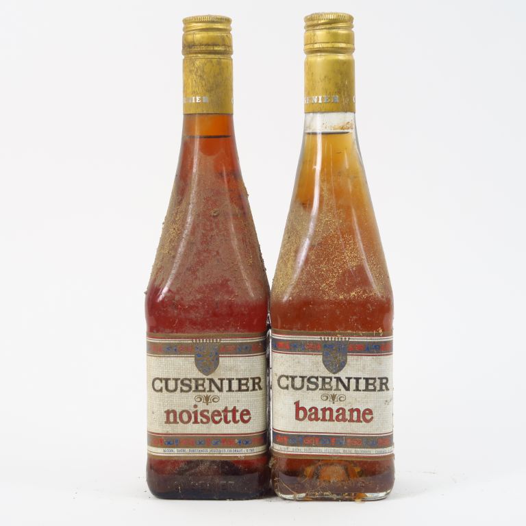 2 VIEILLES BOUTEILLES LIQUEUR CUSENIER : 1 BANANE - 1 NOISETTE
