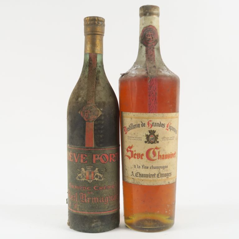 2 VIEILLES BOUTEILLES SÈVE : 1 FORT GRANDE CRÈME DE VIEIL ARMAGNAC - 1 CHAUVIRET A LA FINE CHAMPAGNE