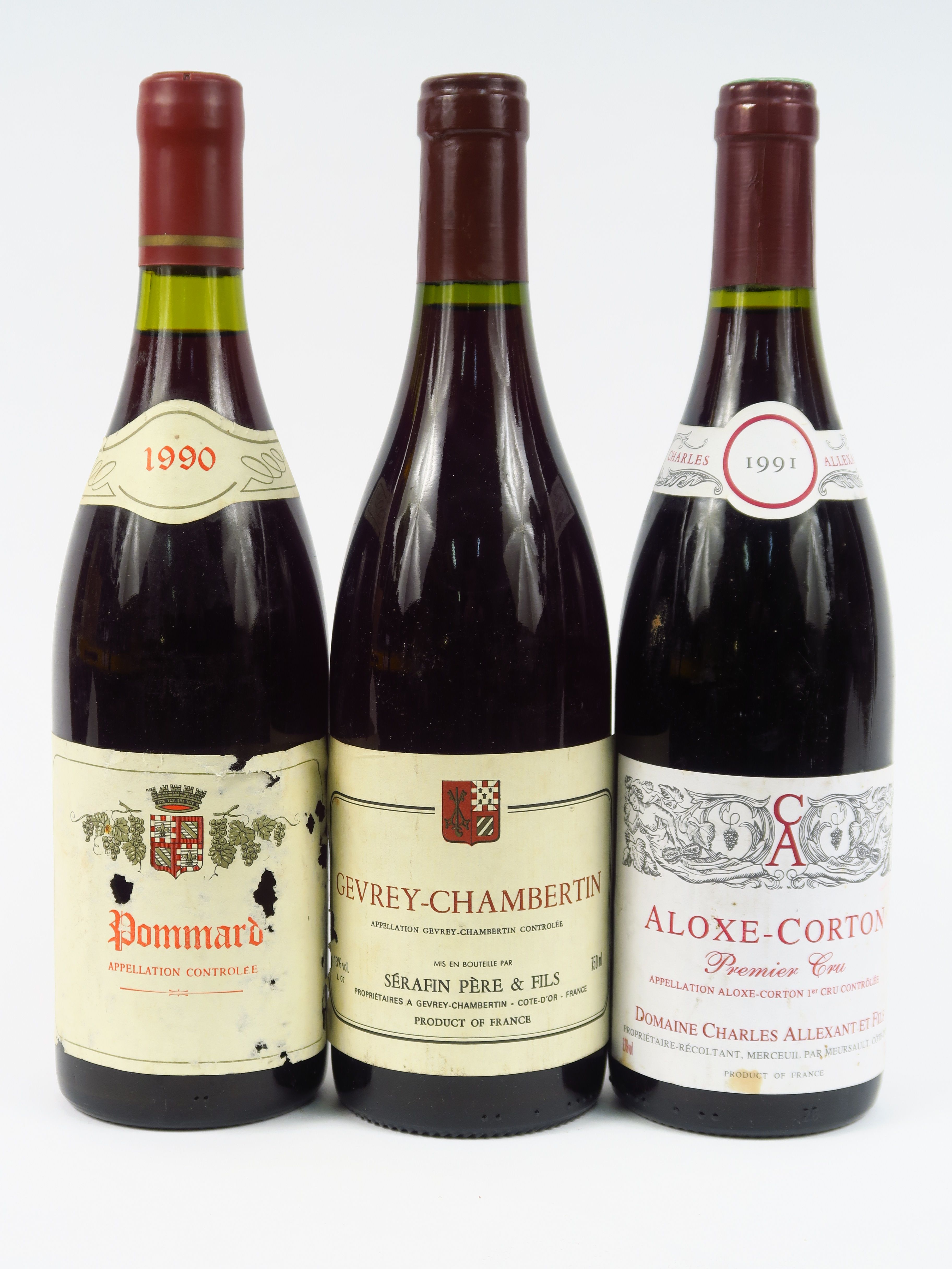 3 BOUTEILLES : 1 ALOXE CORTON 1er CRU C. ALLEXANT FILS 1991 - 1 POMMARD 1990 - 1 GEVREY CHAMBERTIN SERAFIN FILS NM