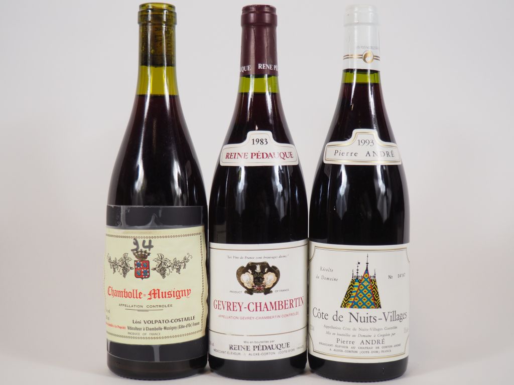 3 BOUTEILLES : 1 CHAMBOLLE MUSIGNY VOLPATO COSTAILLE 2,5 CM/NM/CAPS ABSENTE - 1 GEVREY CHAMBERTIN REINE PEDAUQUE 1983 - 1 COTE DE NUITS VILLAGES PIERRE ANDRE 1993