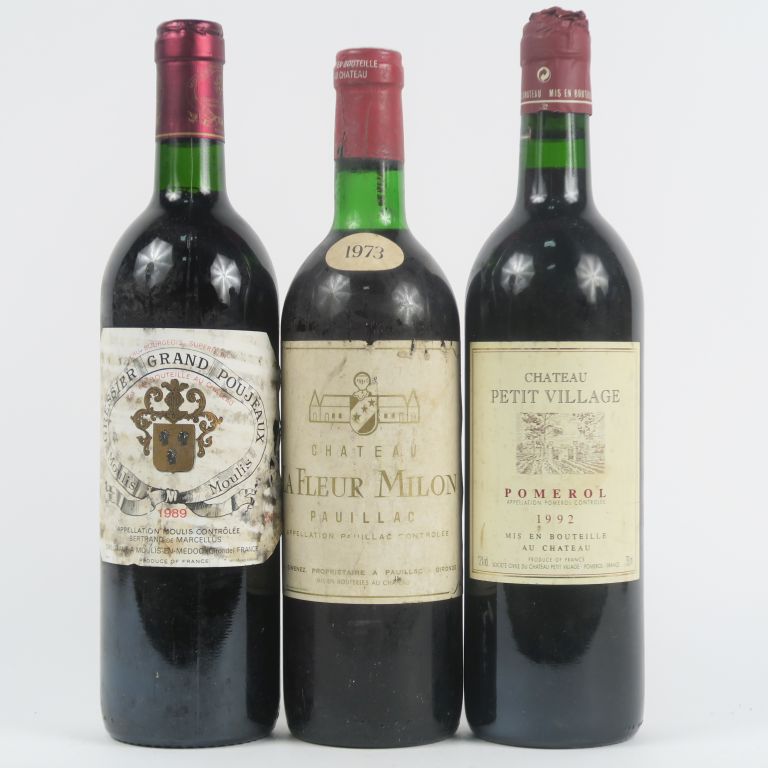 3 BOUTEILLES : 1 CHÂTEAU LA FLEUR MILON PAUILLAC 1973 BG/ELA - 1 CHÂTEAU PETIT VILLAGE POMEROL 1992 CAPS AB - 1 GRESSIER GRAND POUJEAUX MOULIS 1989 EA