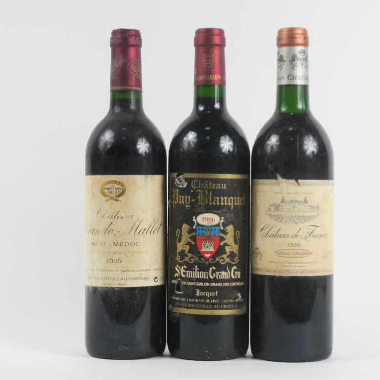3 BOUTEILLES : 1 CHÂTEAU SOCIANDO MALLET HAUT MÉDOC 1995 ELA - 1 CHÂTEAU DE France GRAVES 1988 - 1 CHÂTEAU PUY BLANQUET GC ST EMILION 1996 ELA