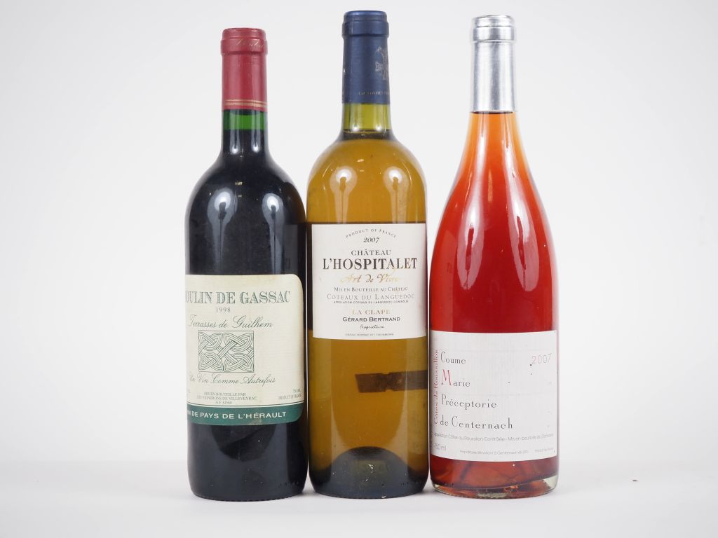 3 BOUTEILLES : 1 MOULIN DE GASSAC "TERRASSES DE GUILHEM" 1998/ 1 CHÂTEAU DE L'HOSPITALET "ART DE VIVRE" COTEAUX DU LANGUEDOC 2007/1 COUME MARIE ROSÉ DOMAINE DE LA PRÉCEPTORIE DE CENTERNACH CÔTES DU ROUSSILLON 2007