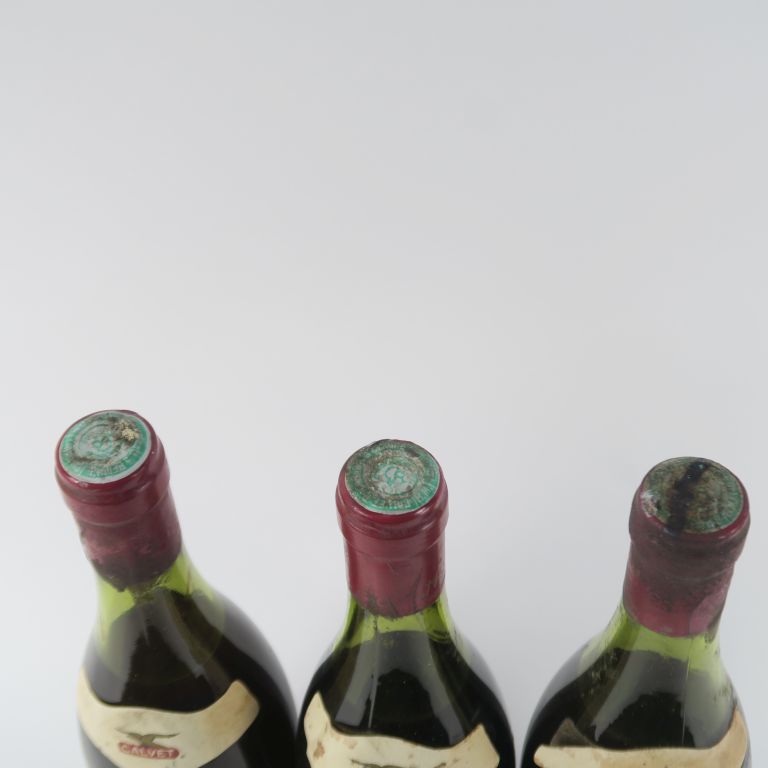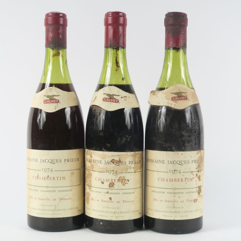 3 BOUTEILLES CHAMBERTIN DOMAINE JACQUES PRIEUR MISE CALVET - 1974 - 1 à 4,5 CM/2 à 5 CM/2 ET/CAPSULES ABIMÉES