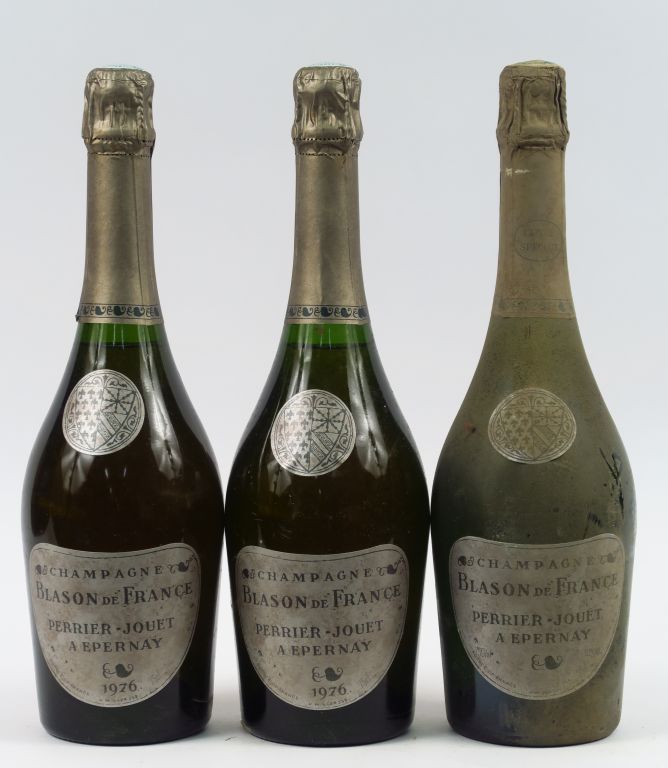 3 BOUTEILLES CHAMPAGNE PERRIER JOUET 'BLASON DE France' - 1976 - 1 à 0,5 CM SOUS LA COIFFE/2 à 1 CM SOUS LA COIFFE/1 BS