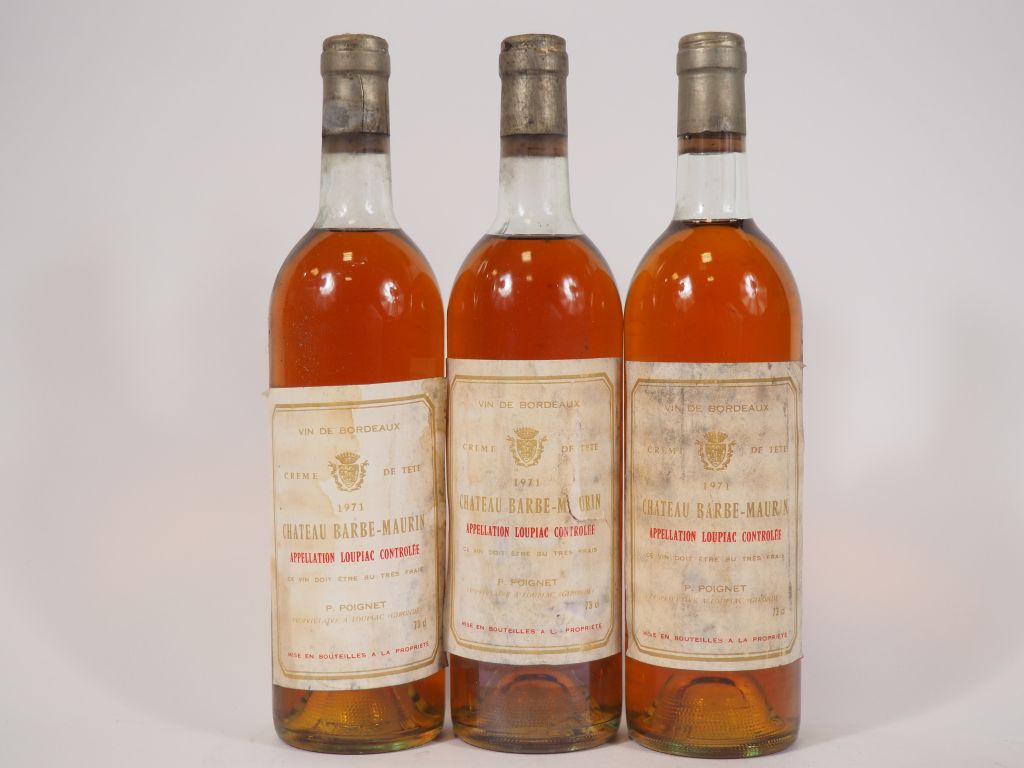 3 BOUTEILLES CHÂTEAU BARBE MAURIN 'CREME DE TETE' LOUPIAC - 1971 - 1 LB/ELT - 1 BG/ETA - 1 HEP/ETA/BOUCHON LEGER CORRODDEE