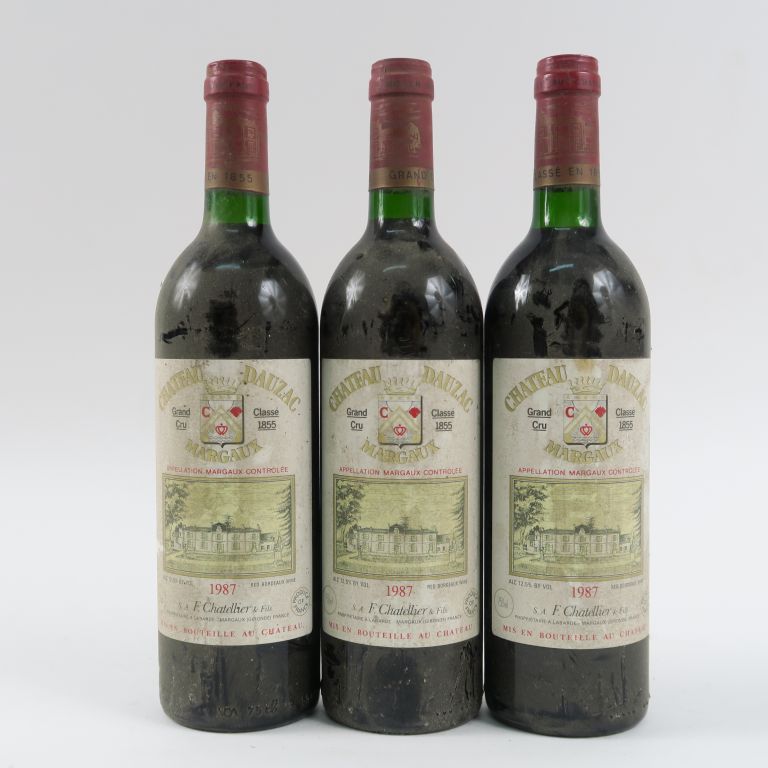 Lot de 3 BOUTEILLES CHÂTEAU DAUZAC GCC MARGAUX - 1987 - BG au prix de 60 à 70 € en vente aux enchères par l'hôtel des ventes Primardeco