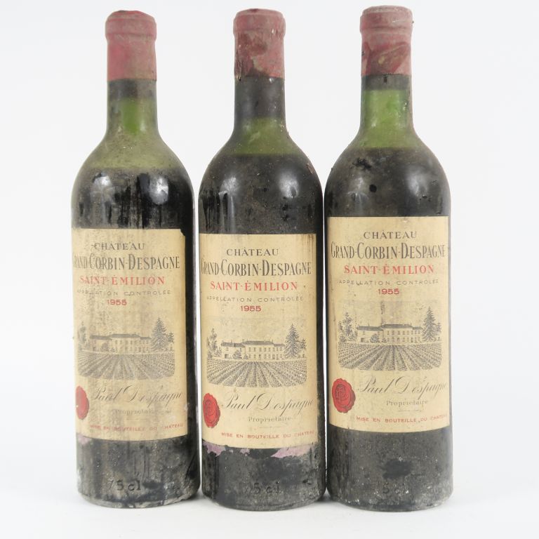 3 BOUTEILLES CHÂTEAU GRAND CORBIN DESPAGNE ST EMILION - 1955 - 1 HEP/1 MEP/1 BEP/BS
