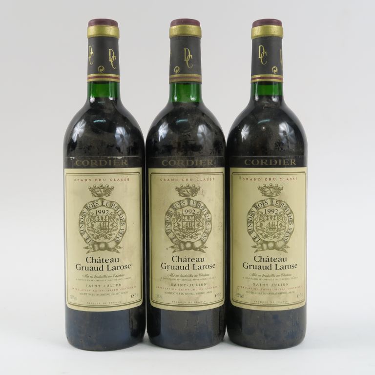 Lot de 3 BOUTEILLES CHÂTEAU GRUAUD LAROSE GCC ST JULIEN - 1992 - 2 BG+/1 BG au prix de 90 à 110 € en vente aux enchères par l'hôtel des ventes Primardeco