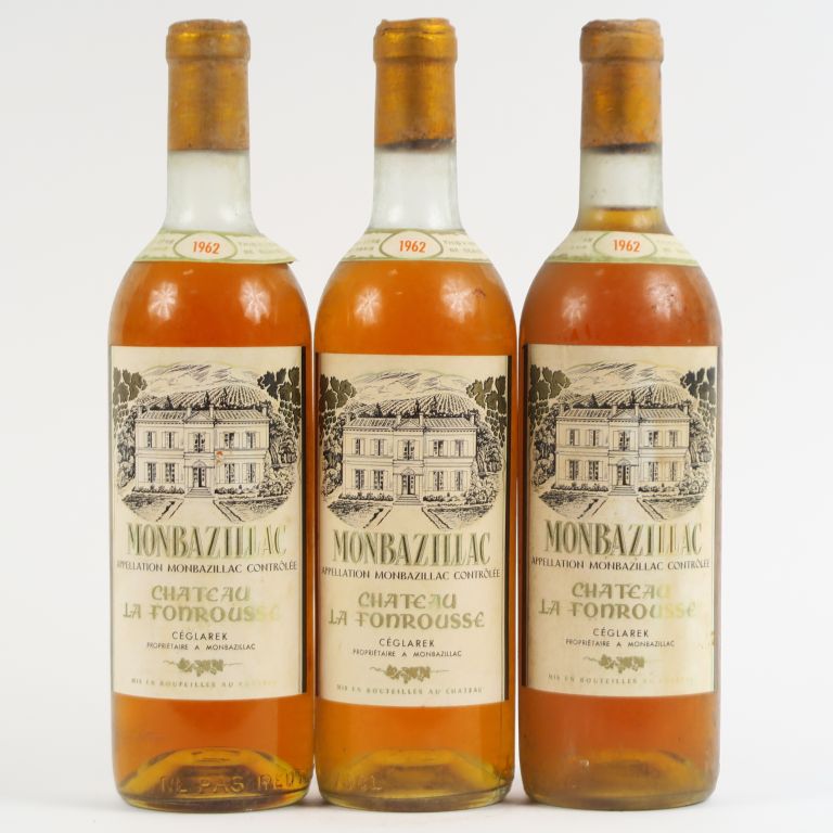 Lot de 3 BOUTEILLES CHÂTEAU LA FONROUSSE MONBAZILLAC - 1962 - 1 BG/1 LB au prix de 80 à 90 € en vente aux enchères par l'hôtel des ventes Primardeco