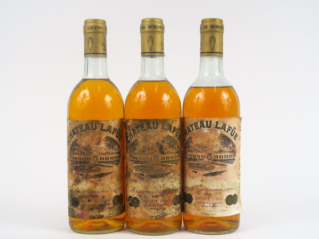 Lot de 3 BOUTEILLES CHÂTEAU LA FÜE STE CROIX DU MONT - 1980 - 2 HEP/1 MEP au prix de 30 à 40 € en vente aux enchères par l'hôtel des ventes Primardeco