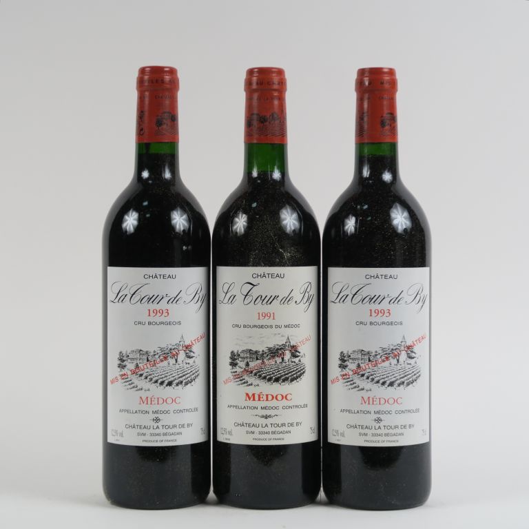 Lot de 3 BOUTEILLES CHÂTEAU LA TOUR DE BY CB MEDOC - 1 de 1991/2 de 1993 au prix de 35 à 45 € en vente aux enchères par l'hôtel des ventes Primardeco
