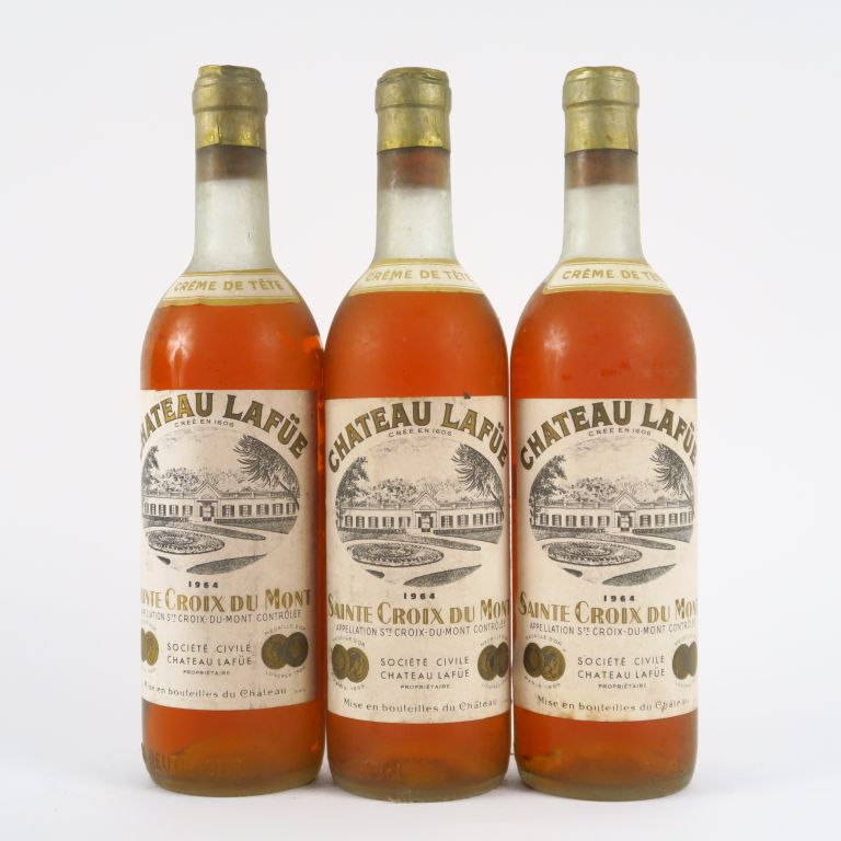 Lot de 3 BOUTEILLES CHÂTEAU LAFÜE 'CREME DE TÊTE' STE CROIX DU MONT - 1964 - au prix de 60 à 70 € en vente aux enchères par l'hôtel des ventes Primardeco