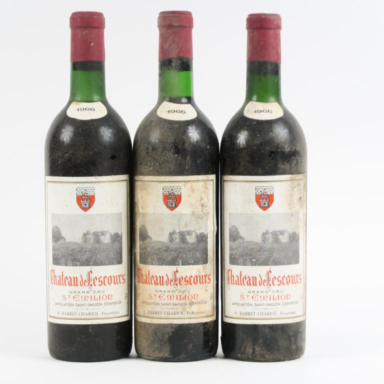 Lot de 3 BOUTEILLES CHÂTEAU LESCOURS GCC ST EMILION - 1966 - 2 BG/1 HEP au prix de 50 à 60 € en vente aux enchères par l'hôtel des ventes Primardeco